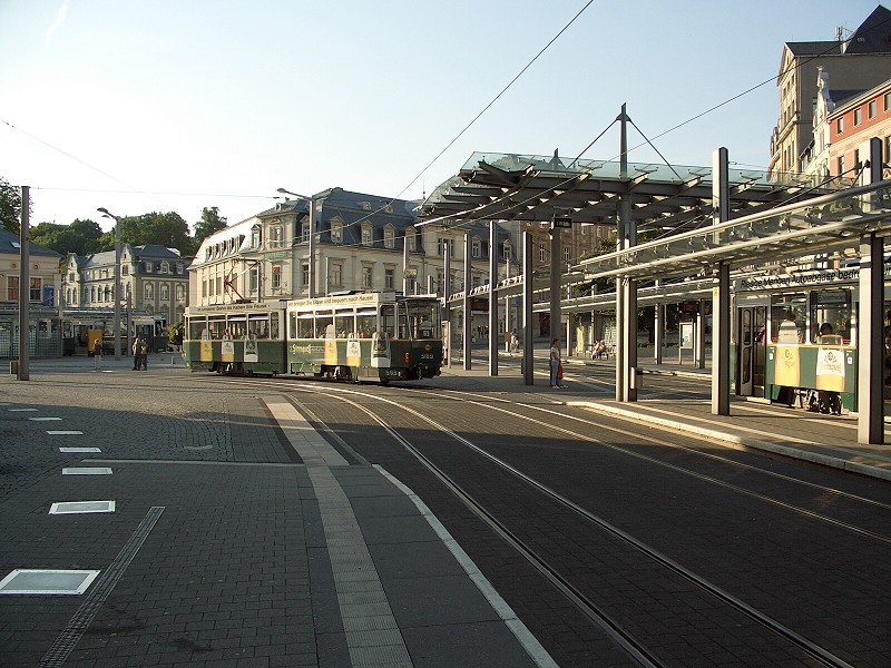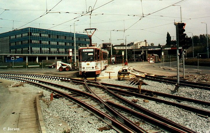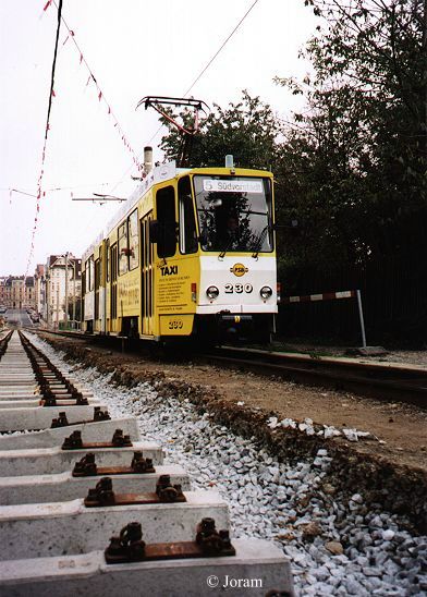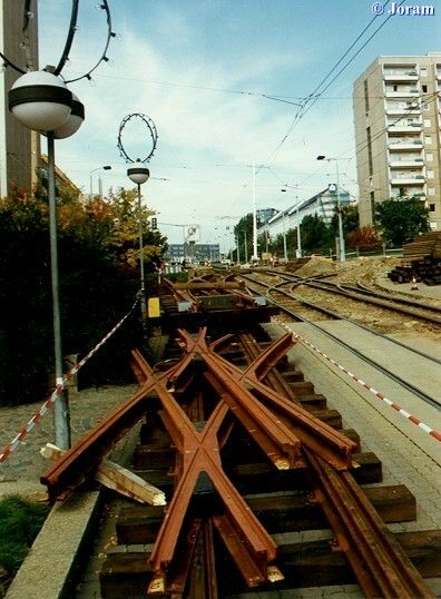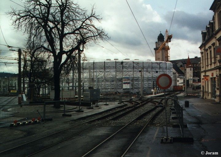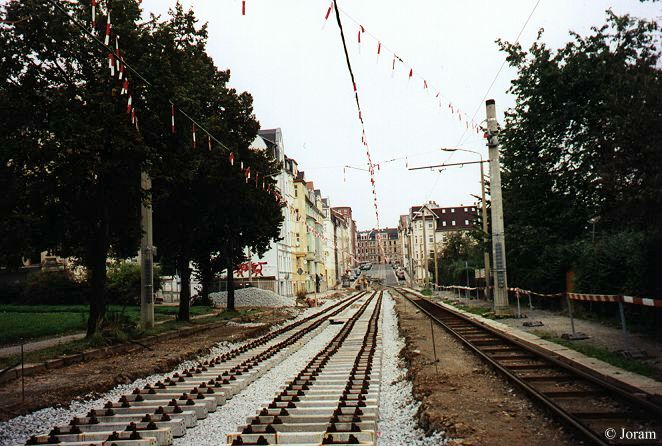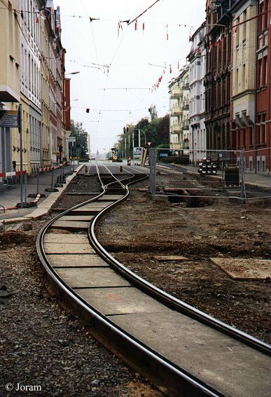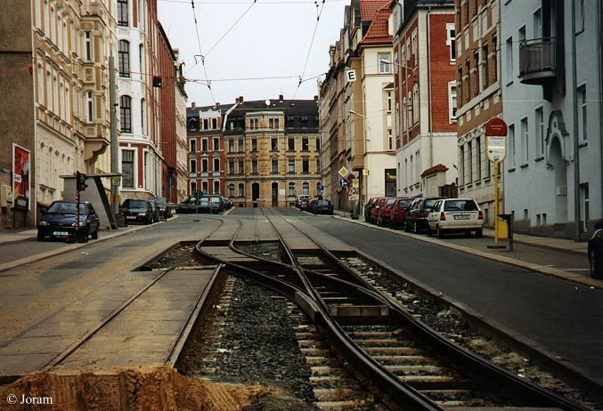 Im September 1996 gelang meinem Vater dieser interessante Schnappschuß am Albertplatz. Am Abzweig von der Bahnhofstraße in die August - Bebel - Straße wird dieses Kreuzungsstück eingebaut werden. Die Erneuerung der Gleise Richtung Preißelpöhl erfolgte bis zur Lutherstraße. Erst im Jahr 2002 werden die weiterführenden Gleise bis zur Chamissostraße erneuert. | ![]() |