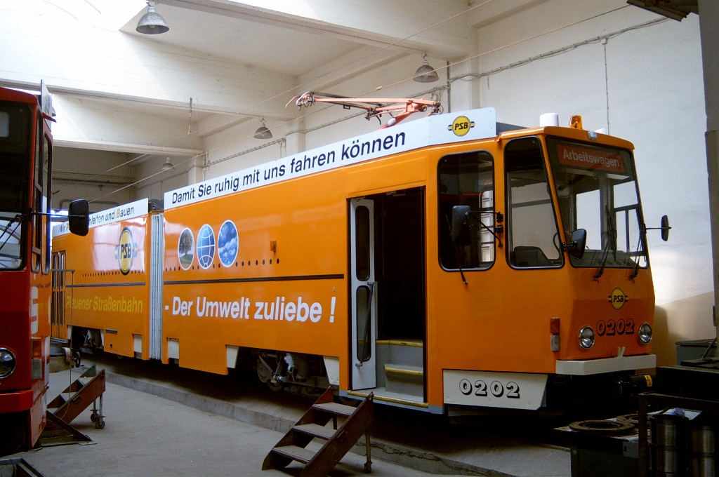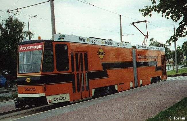 ...das nächste Bild zeigt den Triebwagen 202 im Sommer 1989 am Otto-Grotewohl-Platz. Diese Aufnahme stammt ebenfalls aus meiner Sammlung. Nach einem Umbau bei der Fa. NEOPLAN in Plauen zum ATW0202 ist die Bahn als Gleispflegewagen unterwegs. Die Aufnahme wurde von meinem Vater an der Endstelle Plamag zum Jubiläum 25 Jahre KT4D in Plauen aufgenommen. | ![]() |