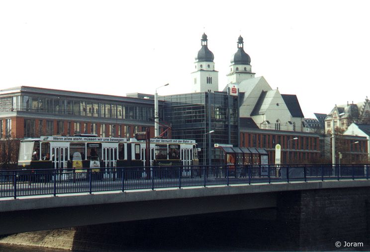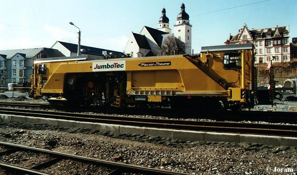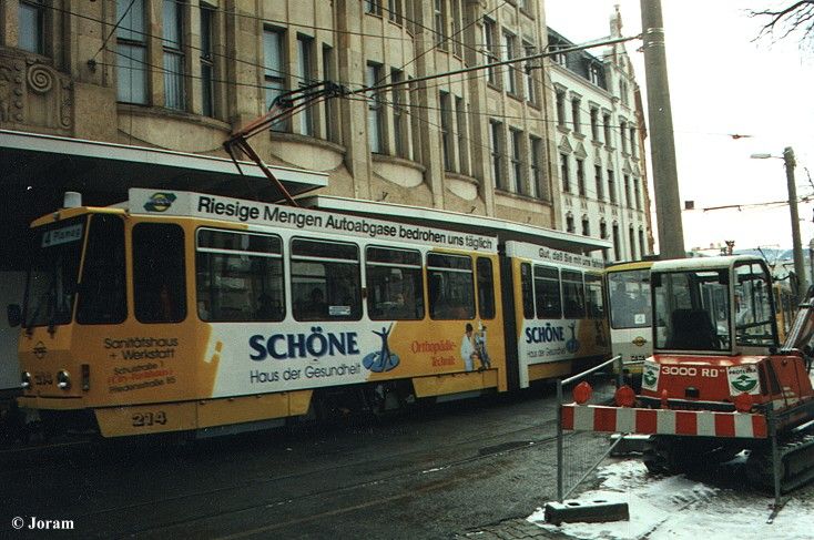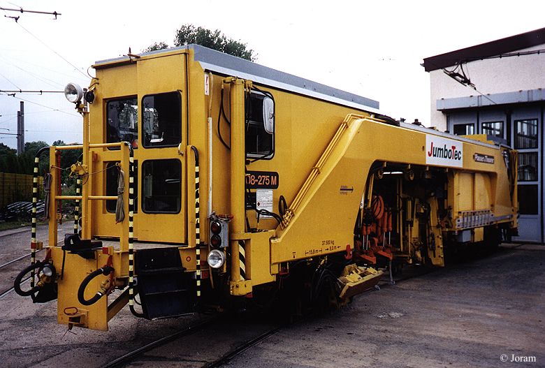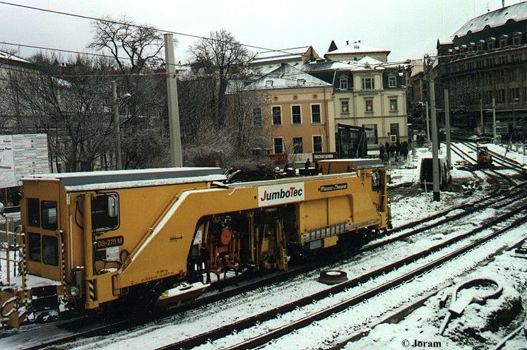 Diese Aufnahme meines Bruders zeigt die JumboTec vor der Gleisbauhalle im Betriebshof Wiesenstraße. Das im Jahre 1991 in Österreich von der Fa. Plasser und Theurer gebaute 39 to "Schwere Nebenfahrzeug" mit der genauen Artbezeichnung Universal - Gleisstopfmaschine 08-275 Metropolitan besitzt die Maschinen-Nr. 929. Der Inhaber ist die Fa. Gleisbau Geiseltal GmbH, Beuna. Rechts ist die Maschine im Einsatz auf der Syrastraße im März 2001. Im Hintergrund die 1122 erstmals urkundlich erwähnte Johanniskirche. | ![]() |