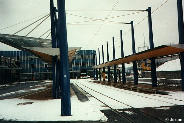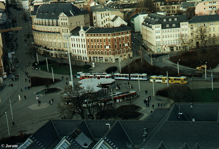 Mein Vater hat am 05. Dezember 1999 die zentrale Haltestelle Tunnel vor dem Umbau vom Rathausturm herunter aufgenommen. Für alle Nicht-Plauener sei erwähnt, daß der Name Tunnel daher rührt, daß unter dem Platz ein Flüßchen namens Syra fließt. Vor dem Krieg lag die Syra noch offen und im Bereich der Straßenbahnhaltestelle gab es eine relativ breite Brücke mit drei tunnelförmigen Röhren. | ![]() |