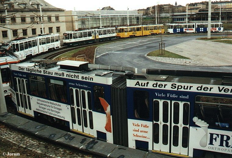 In der Zeit vom 17. - 22. März 2001 wurde das Streckennetz durch die Bauarbeiten (siehe unten) im Stadtzentrum in zwei Teile getrennt - in ein oberes Netz nördlich der Syrastraße und in ein unteres Netz südlich der Weißen Elster. Die Arbeiten zwischen Tunnel und neuer Elsterbrücke verhinderten, daß die Bahnen aus dem oberen Netz nach Dienstende in den Betriebshof Wiesenstraße einfahren konnten. So wurden die Endstellen zum Abstellen der Triebwagen genutzt. Tagsüber befanden sich auf dem 2. Gleis der Schleife am Oberen Bahnhof einige Triebwagen als Einsatzreserve. Die Bilder wurden von meinem Vater in dieser Zeit aufgenommen. | ||