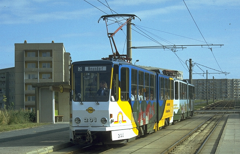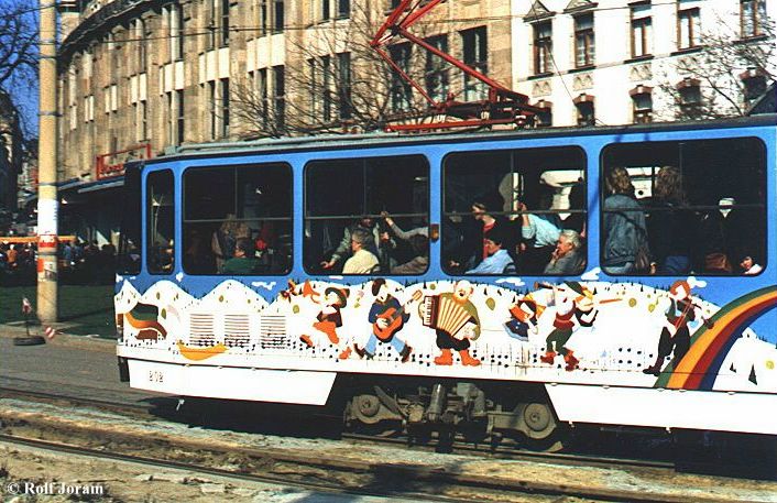 Mein erstes Bild von einem KT4D aufgenommen im Sommer 1976 am Otto-Grotewohl-Platz (Tunnel) kurz nach der Anlieferung im Originalanstrich elfenbein-rot. Plauen erhielt 1976 zwei Triebwagen der Nullserie. Der zweite Wagen Nr. 201 steht zur Zeit im Technischen Museum in Prora, jedoch ist sein Zustand dort sehr beklagenswert... | ![]() |