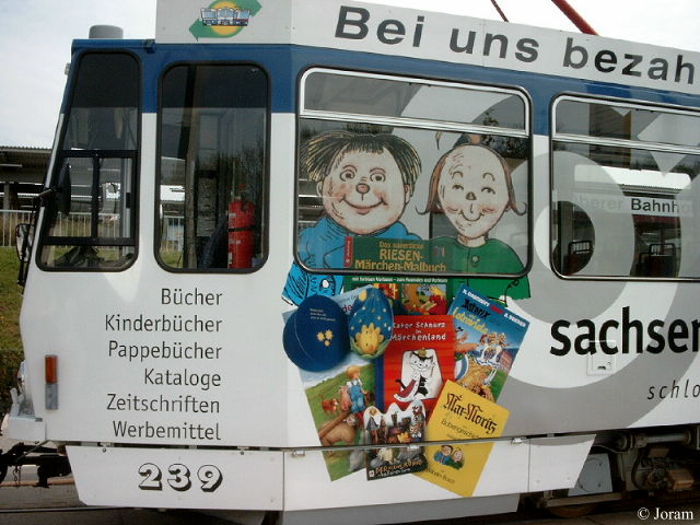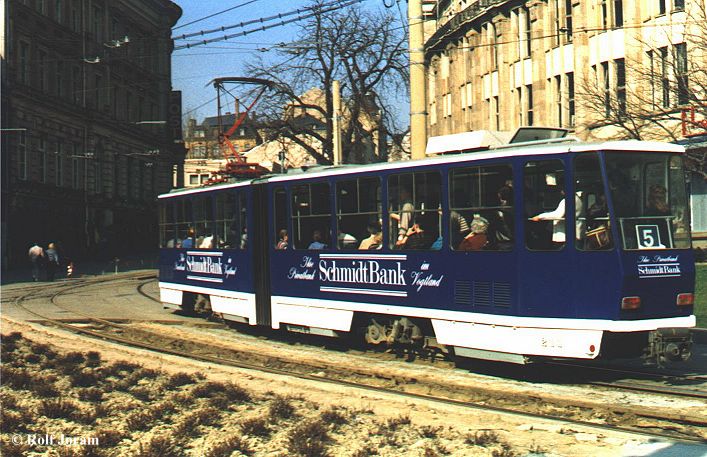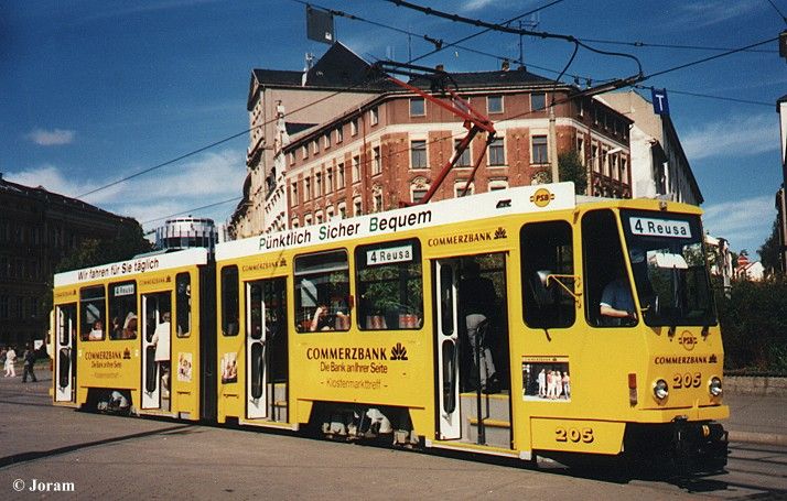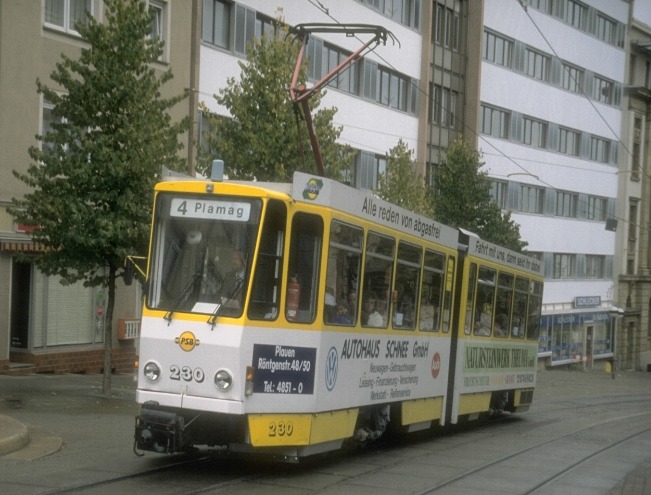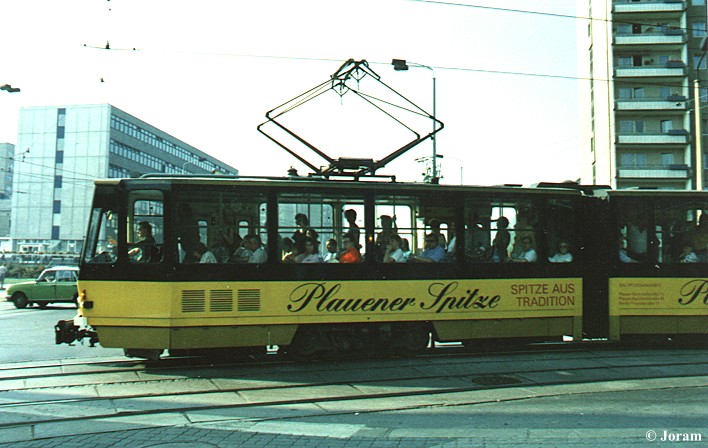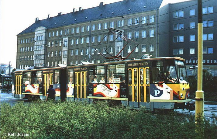 Die Gelenktriebwagen 203 und 204 trafen mit der ersten Lieferung von Serienfahrzeugen dieses Typs im Jahr 1981 in Plauen ein. Der Triebagen 203 war der erste Wagen mit Vollwerbung in Plauen. Andere Wagen folgten danach sehr schnell. Die beiden Bilder zeigen diese ersten Werbungen und wurden von mir im Sommer 1989 am Platz der Roten Armee (Albertplatz) aufgenommen. | ![]() |