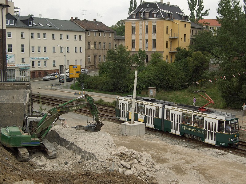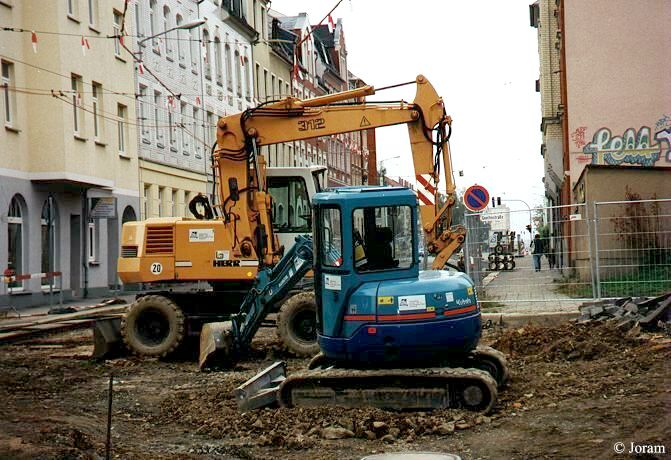 Die nächsten drei Bilder zeigen den stadteinwärtigen Beginn der Baustelle zwischen Lutherstraße und Goetheplatz, das Gleisprovisorium und die Schwellen für die neue Trasse am Goetheplatz und das stadtauswärtige Ende der Baustelle an der Chamissostraße. Den interessanten Schnappschuß der beiden Baumaschinen hat mein Bruder auf den Namen "Vater und Sohn" getauft. | |