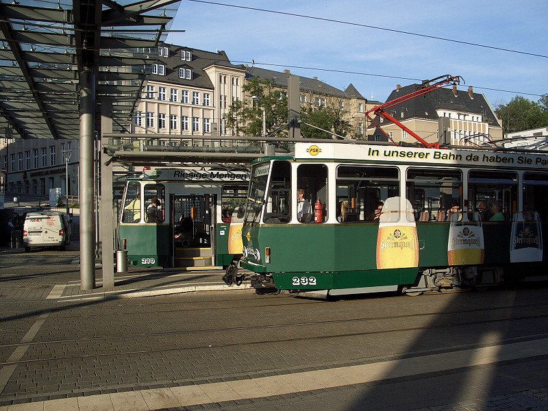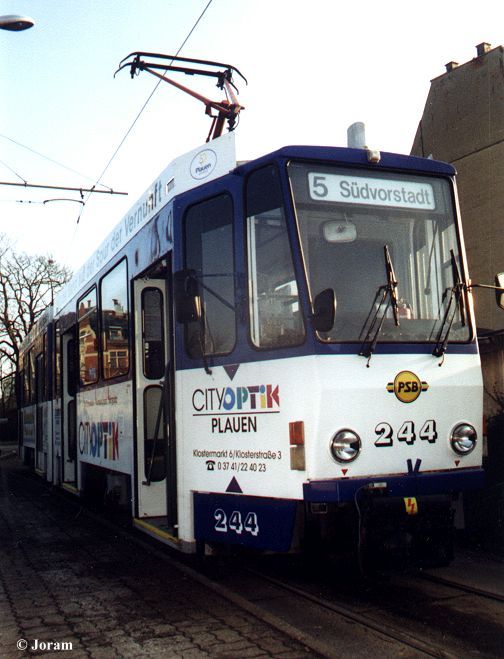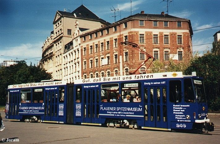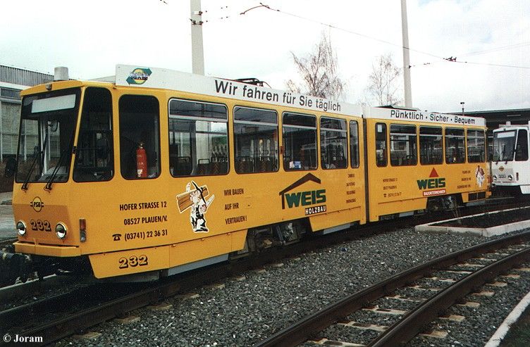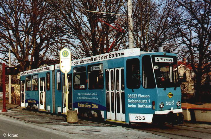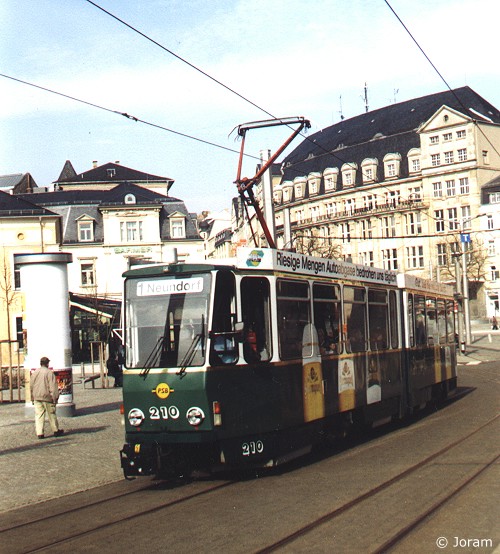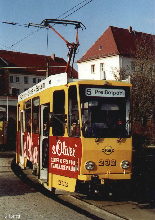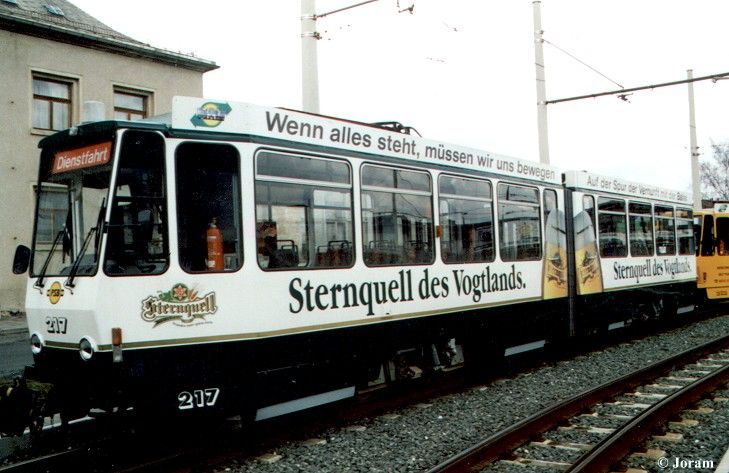 Die Aufnahmen von den TW 201+TW 221 (die Anstriche der Bahnen dokumentieren die Städtepartnerschaft zwischen Hof in Bayern und Plauen) aufgenommen am 23. September 1991 im Chrieschwitzer Hang und vom TW 230 am 05. Oktober 1996 auf der Bahnhofstraße stammen von Herrn Hans-Jürgen Hankmann. Auf seiner HP www.tramwaypics.de stellt er seine Aufnahmen zur nichtkommerziellen Verwendung auch auf anderen HP frei zur Verfügung. Auf der HP sind wirklich sehr schöne Bilder von allen Betrieben in Deutschland und von einigen anderen ausländischen Betrieben zu finden. | ![]() |