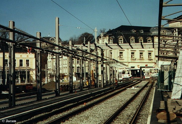 Die Bauarbeiten für die Errichtung einer Verknüpfungsstelle von Eisenbahn, Straßenbahn, Bus und Taxi am Oberen Bahnhof begannen am 03. November 1998. Die Abfahrtssteige des ehemaligen Busbahnhofes im Innenfeld der Straßenbahnschleife wurden komplett abgerissen. Hierfür entstand ein Parkplatz. Die Straßenbahngleise wurden bis zum Anschluß an die Bahnhofstraße erneuert. Die verlagerte Straßenbahnhaltestelle Oberer Bahnhof erhielt eine Überdachung und dient jetzt gleichzeitig als Bushalteplatz. Die beiden Bilder sind Aufnahmen meines Vaters. Im Oktober 1999 ist links der Anschluß an die Bahnhofstraße zu sehen, darunter die am 22. Dezember 1999 eingeweihte Haltestellenüberdachung. | ||
