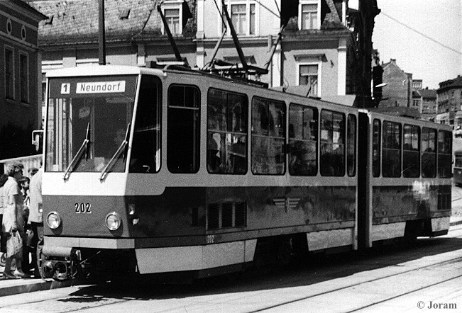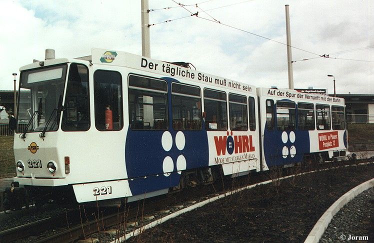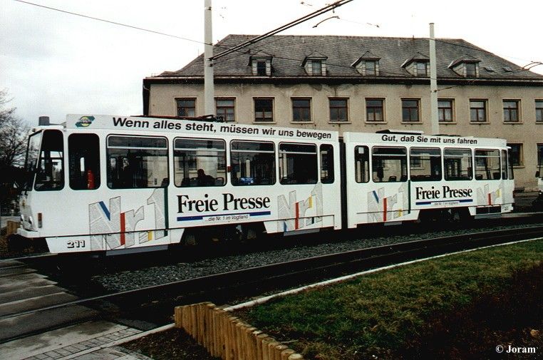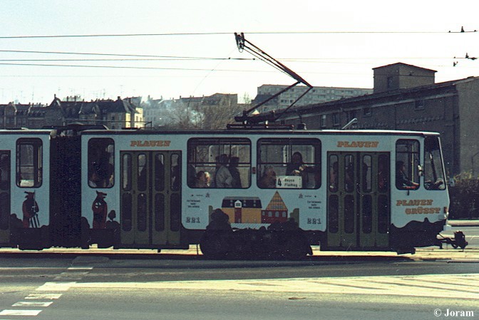 Die Triebwagen 216 und 221 stammen aus der zweiten Lieferung von Serienfahrzeugen im Jahr 1983. Auf den Bildern sind beide noch mit der Vollwerbung aus DDR - Zeiten versehen. Ich habe die Aufnahmen im Sommer 1989 geschossen. Der Triebwagen 216 ist am Platz der Roten Armee (Albertplatz) und der TW 221 auf der Reichenbacher Straße aufgenommen. Zu den Vollwerbungen ist zu sagen, daß die Plauener Straßenbahn meines Wissens die einzige in der DDR war, die ihre Fahrzeuge derart verschönte. | ![]() |