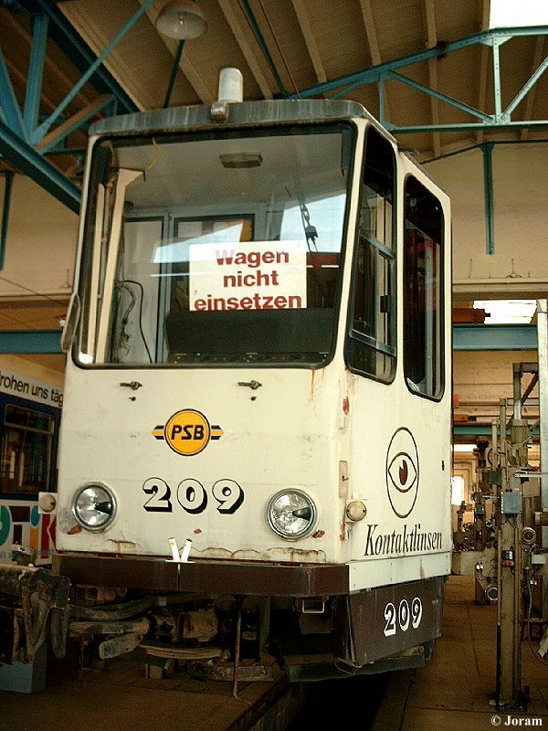 Das Ende naht - am 05. Mai 2003 habe ich den TW 209 in der Werkstatt Wiesenstraße fotografiert. Der Wagen, schon längere Zeit abgestellt, wird zur Ersatzteilspende auseinandergenommen. Sein Ende rückt in nahe Zukunft - es ist somit das erste Fahrzeug dieses Typs, daß in Plauen ausgemustert wird. Zuvor sind nur die TW 201 (nach Prora als Museumsfahrzeug) und TW 222 (nach Zwickau und dort noch im Einsatz) aus Plauens Stadtbild verschwunden. Der Typ KT4D wird aber noch lange Zeit hier erhalten bleiben, eine stufenweise Erneuerung des Wagenparks ist erst ab 2007 geplant. | ||