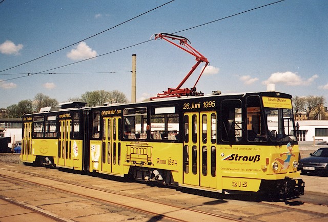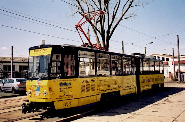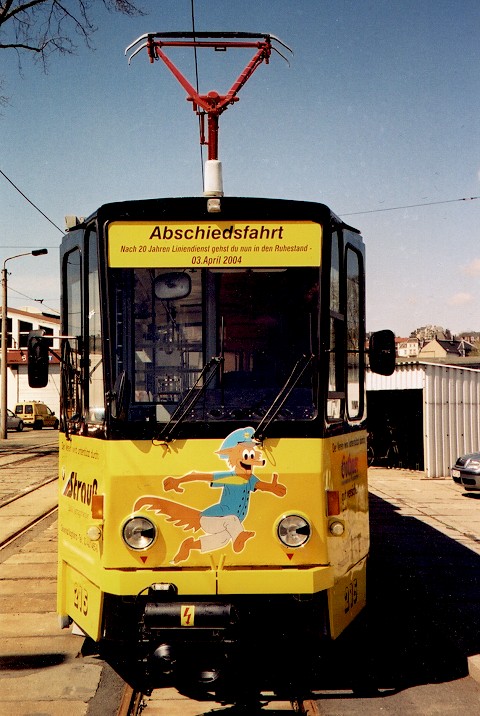 Der TW 215 kurz vor seiner letzten Fahrt auf Plauens Gleisen am 03. April 2004 im Betriebshof Wiesenstraße. Der letzte Wagen mit Beschleuniger wird nun aussortiert. In den letzten Jahren wurde er durch den Traditionsverein der PSB für Sonderfahrten eingesetzt. | ![]() |