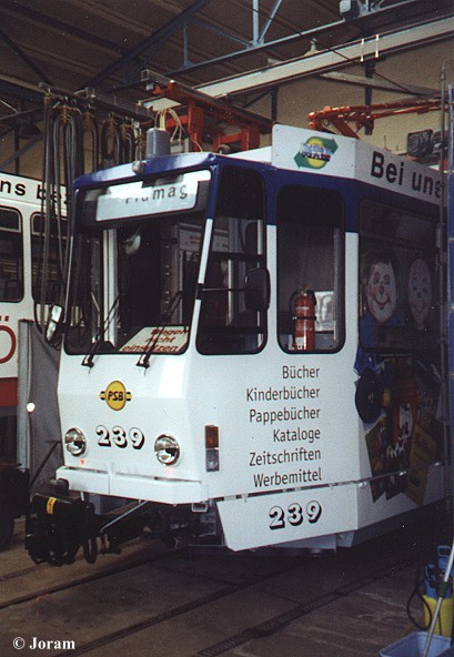Die Triebwagen 239, 240 und 242 kamen mit der letzten Lieferung von KT4D - Bahnen über Zwickau 1989 nach Plauen. Das nebenstehende Bild von meinem Vater zeigt Wagen 239 in der Werkstatt Wiesenstraße. Es wurde im Herbst 2002 aufgenommen. ... | ![]() |