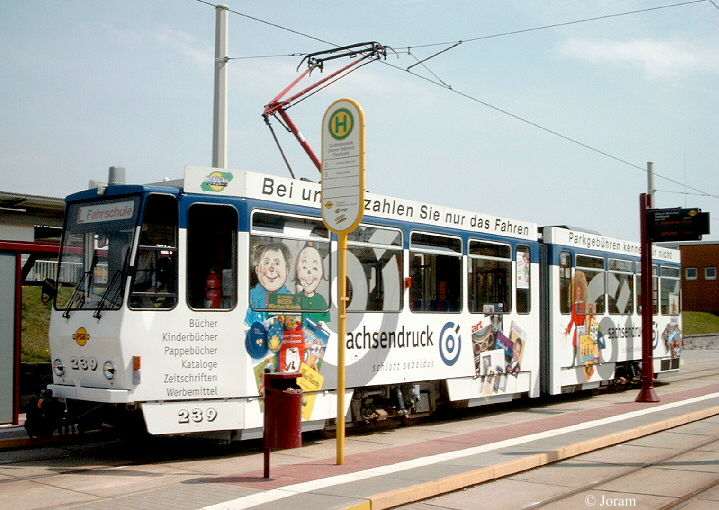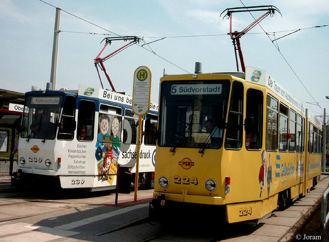 Am 26. April 2003 habe ich den TW 239 an der Endstelle Oberer Bahnhof (Stadtpark) aufgenommen. Der Wagen war als Fahrschulfahrzeug zum Straßenbahn selber fahren unterwegs. Ich war selbst einer der Fahrschüler an diesem Tag. Es ist wirklich ein tolles Erlebnis, ein 20 to schweres Gefährt durch die Stadt zu bewegen. Einen kleinen Bericht darüber habe ich auf der Seite Vermischtes eingefügt. Auf dem zweiten Foto kreuzt der TW 224 auf der Linie 5 Richtung Südvorstadt das Fahrschulfahrzeug. | |||